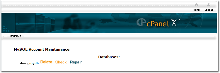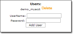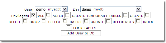 Now, take a look at the users form you used to create the account. You should see your new user account listed above it. Note that in this example, the name of the account is "demo_myacct" even though you entered "myacct" for the new user. Many web hosts prefix the account name you use to login to the control panel in front of the mysql username, to ensure that the account is unique. The name displayed is the true name of the account that you just created. If it differs from what you originally typed in, then be sure to write down the way it appears after creation, as this will be the name we will use later on in Squirrelcart's configuration file.