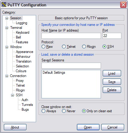 Once you have downloaded Putty, launch it. You should see a dialog box similar to this: