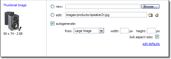 Image fields appear on certain records. Some common records that contain image fields are Products and Categories. Below is an overview of each component of an image field. Please note that some components require GD v1.6.2 or newer, and will not be present if GD is not available. We will note which components that require GD below.