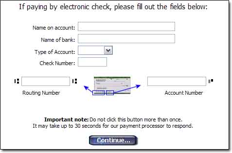 Electronic Check is also known as Direct Debit. It is a payment method that allows the customer to pay using their checking account. They enter their account number, routing number, and other info on the payment form, and Squirrelcart submits it to a payment gateway for processing. Currently, only our Authorize.net and LinkPoint payment gateway integrations support electronic checks.