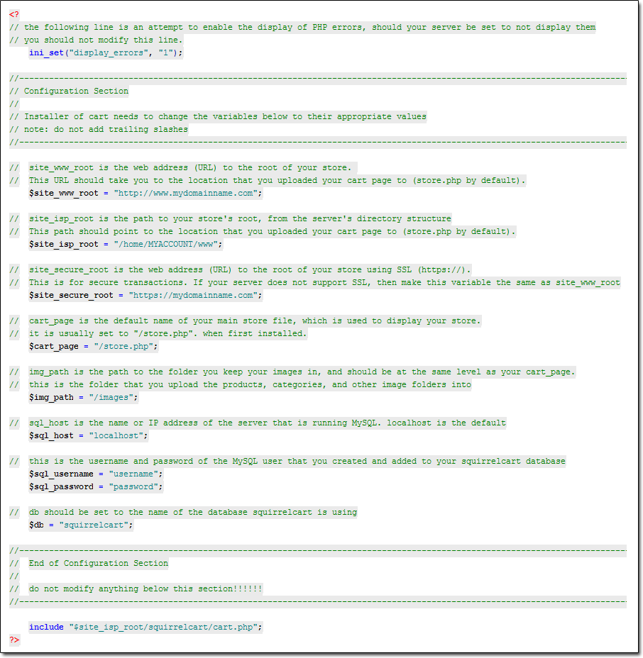 In the image above, the variables that you need to set appear in black text. You will be modifying the text following the variable name, that appears between the quotes. Instructions for setting each variable appears immediately above. Be sure to leave the semicolon after each line to avoid PHP parse errors. After you have modified the file, save it.