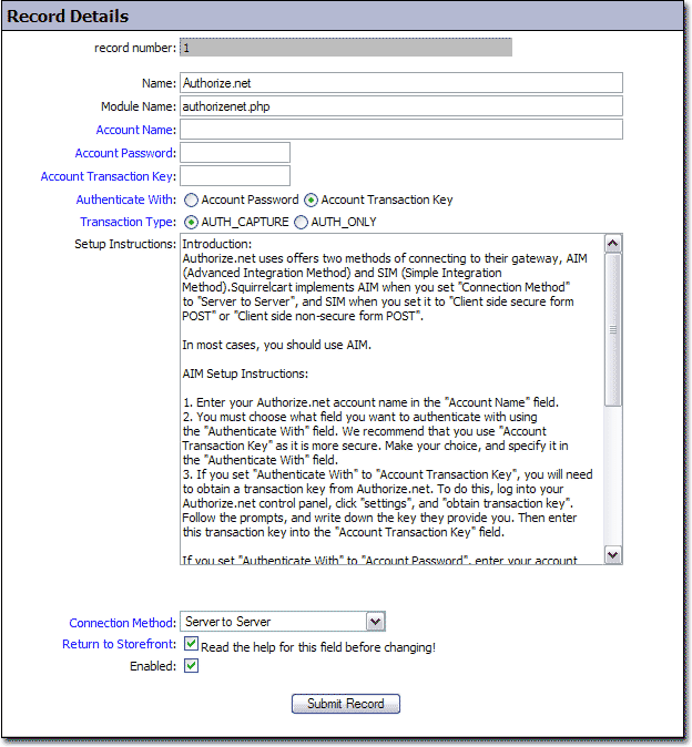 - Checking this field turns the gateway on in Squirrelcart.