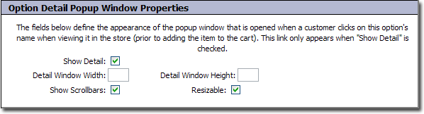 - Controls whether or not the popup window that appears when a customer clicks on an option's name in the checkout form is resizable. This only applies when the "Option Type" is set to "Text Input" or "Textarea Input". Checking this box will allow scrollbars, unchecking will not.