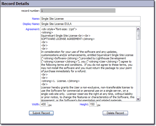- This field contains the actual agreement. It will accept HTML or plain text.