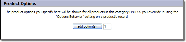 The product options on the category records work exactly as they do on the product records. The only difference is that the options added at the category level appear on all products within that category, unless overrided. See the "Adding Options to Products" topic in the Products section for more info.
