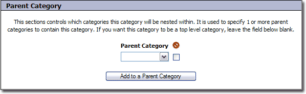 - A description of the category. This appears immediately below the category's name in your content area. The field excepts HTML or plain text.