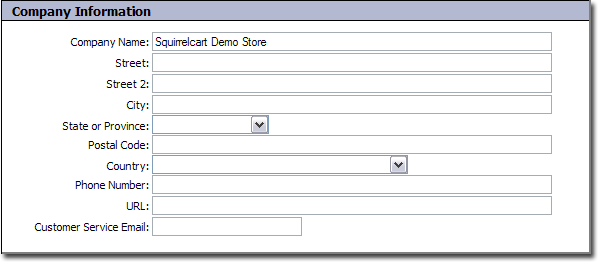 Squirrelcart uses the information in this section whenever it needs information about your company. This information is used for various features throughout the cart. It is important that you fill this section out as accurately as possible.