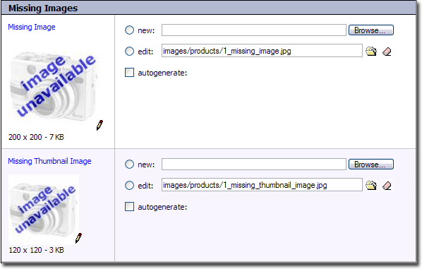When a product does not have an associated image, or thumbnail image, these images are displayed in their place.