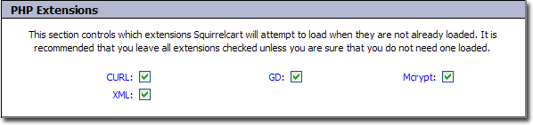 If an extension is checked, and it is not already loaded, Squirrelcart will try to load it. We recommend that you do not modify this section under normal circumstances.