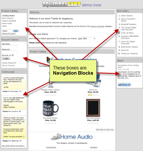 Navigation Blocks are areas (boxes by default) that contain links and other HTML specific to navigating particular areas of your store: