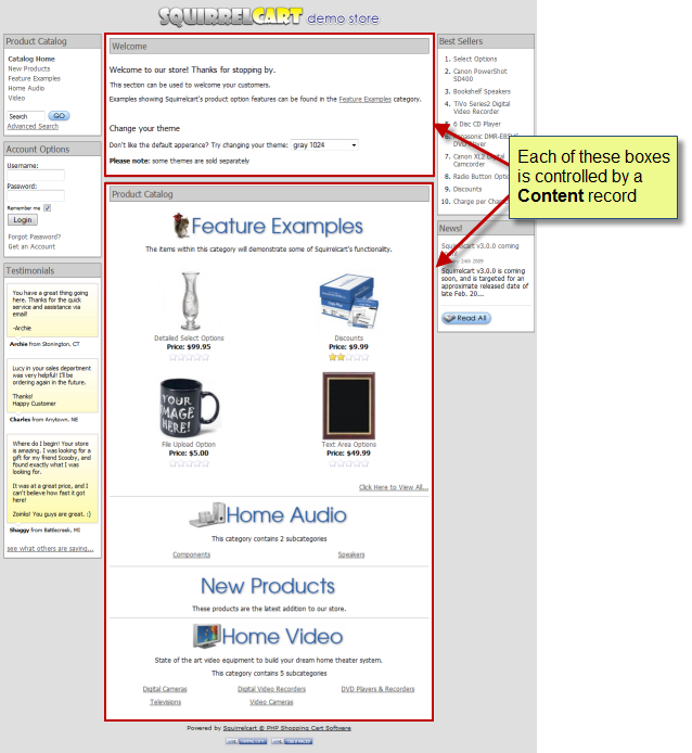 Squirrelcart comes with some built in content records, and you can easily create your own to add any information you like.