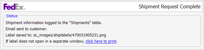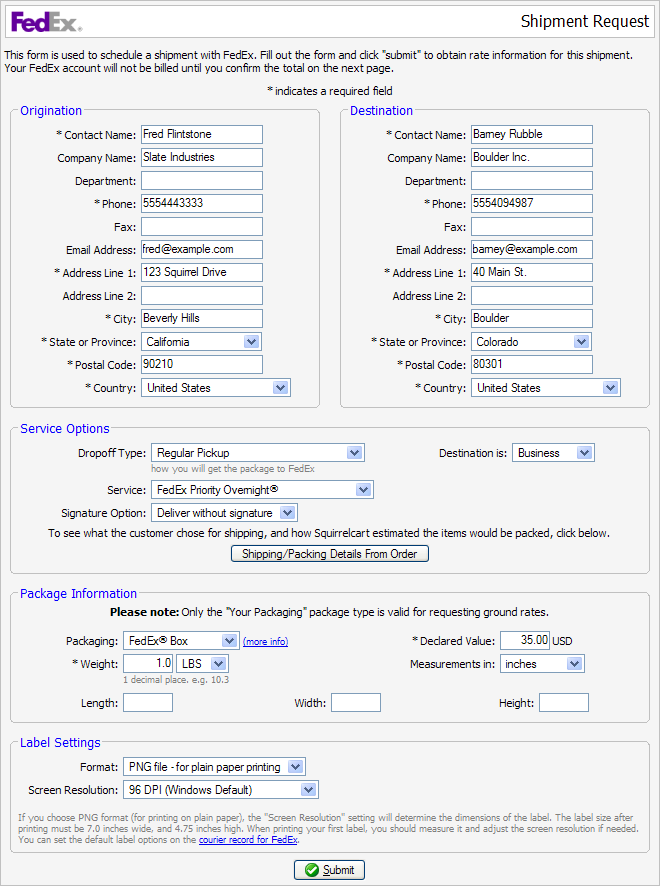 Squirrelcart allows you to submit shipments directly to FedEx over the web. The shipments get assigned a tracking number, you print out the label, and the customer receives a ship notification email (if enabled). You can then attach the label to your package and drop it off at a FedEx location, drop box, or include it in your regularly scheduled pickup.