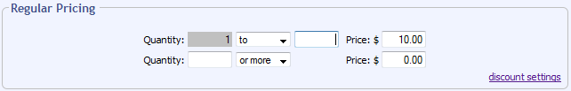 If you make a mistake or need to remove quantity based pricing, just change the first drop down field in the price section you are working with back to "or more" and the pricing rows below it will be removed. |