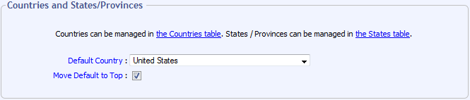 This section gives you access to country and state/provicne settings. To manage countries, click the Countries table link. To manage states/provinces, click the States table link.
