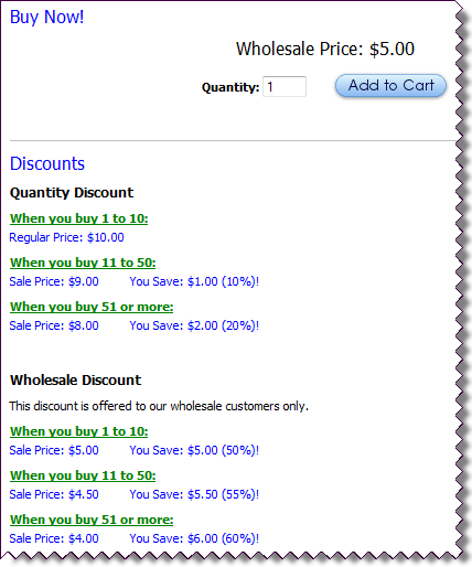 By default, quantity based discounts are advertised to your customers on a product's detail page. Discounts as described in the two examples above would appear below the "add to cart" button as follows: