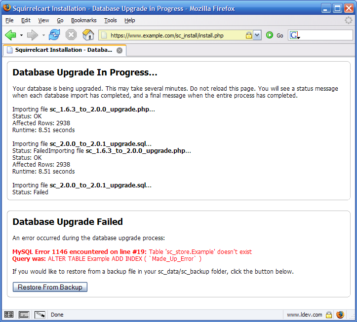 If you receive a Database Upgrade Failed error during the Installation / Upgrade script process, use this topic as a guide to report the problem and get back up and running. A generic error is shown below to demonstrate what a database upgrade failure may look like: