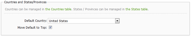 This section gives you access to country and state/province settings. To manage countries, click the Countries table link. To manage states/provinces, click the States table link.