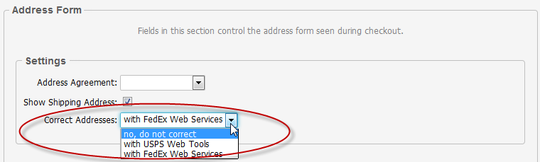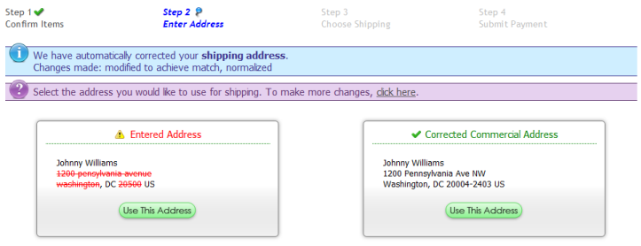 Address validation can be enabled using Endicia, USPS Web Tools, FedEx Web Services, or Fastway. It is used to ensure shipping addresses are accurate. When enabled, shipping addresses entered in the storefront and in the control panel will be checked using an address validation service. If a correction is found, the customer will be given the opportunity to correct their address automatically. In the storefront, it looks like this: