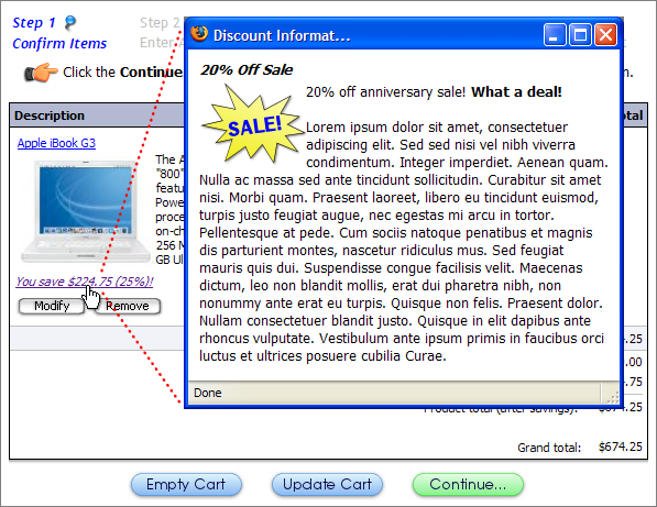 If Discount Checkout Display is set to popup window, the advertisement appears when you click the link below the image of the product: