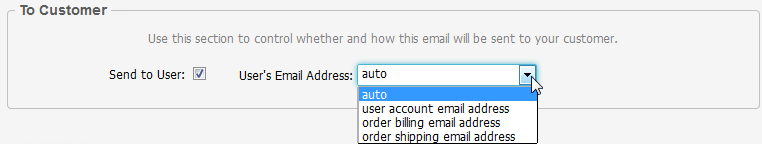 This determines which email address to use when sending an email to a user. When set to auto, Squirrelcart will use the email address on the user account. If no user account exists, the billing email address from an order will be used, followed by the shipipng email address.