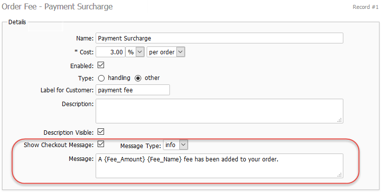 - By default, a message will be shown when the fee is added. You can change this using the Message field higher up on the record form.