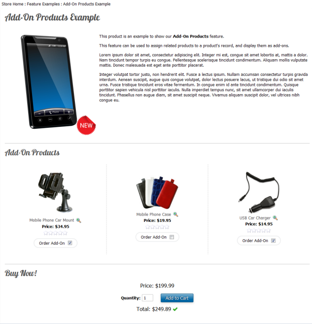 Related products can be configured to be offered as "add-on products". Add-on products act like options for another product. For example, you may have a phone product and wish to offer other products as add-ons, such as chargers, cases, etc...