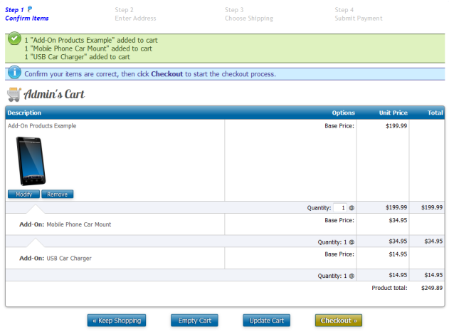 Because add-on products are also regular products, they can also have options themselves. For example, you may have a computer product and want to offer a hard drive as an add-on. That hard drive could have a capacity option to choose the size of the drive.