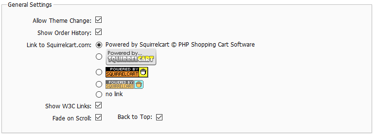 This field controls the appearance of the link back to Squirrelcart.com at the bottom of your cart page. You can remove that link by selecting no link