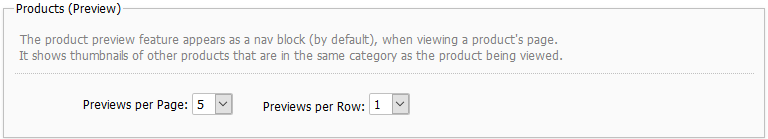 If you are using the product preview feature, set this number to the number of items you would like to have displayed in the product preview. This is the navigation that is displayed by default to the right of a product's detailed description, and lists links and thumbnails for other products in the category, for easier navigation.