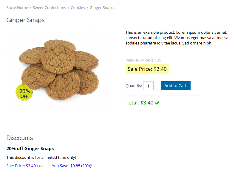 If advertising is enabled for a discount, it will appear on the product's detail page in your storefront, as in this example: