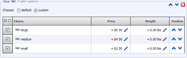 Each of the topics in this section for adding options discusses the Default Price and Default Weight fields. These 2 fields are located in different places depending on the type of option used. For Select and Radio options, they appear on the Choice records for that option. Because the other option types (Text, Textarea, and Checkbox) do not have more than one choice, the Default Price and Default Weight fields appear on the Options themselves.
