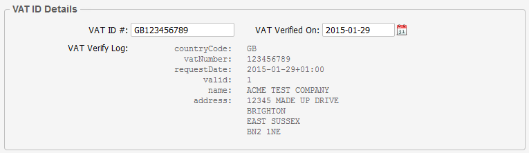 When VAT ID Verification is enabled, and a user enters a VAT ID # on their account, a request is made behind the scenes to a web service provided by VIES for the purpose of verifying VAT ID numbers. If the VAT ID is verified, the VAT Verified On field on the user's record in the control panel will show the date on which the verification was made. The VAT Verify Log field immediately below it will show the actual data received from the web service: