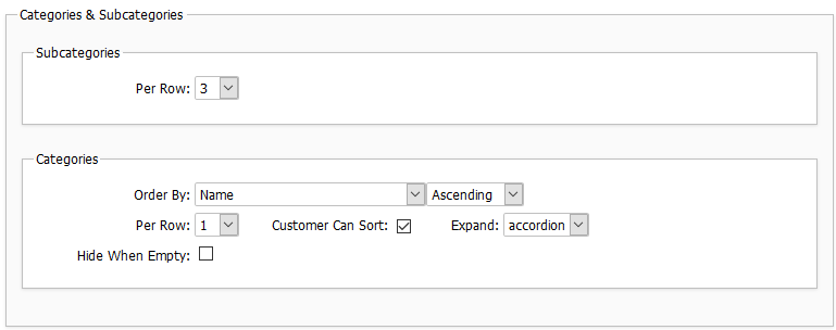 This field controls when (or if) parent categories in the Product Catalog navigation are expanded to show the subcategories beneath them. This section appears to the left of the page by default.